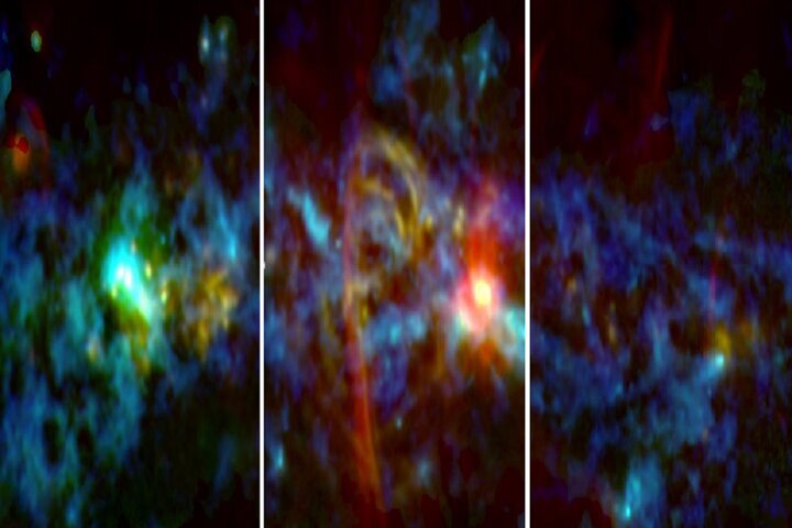 آگاه: دانشمندان با استفاده از تجهیزات ساختهشده ازسوی «مرکز فضایی گادرد» ناسا و یک تلسکوپ رادیویی در اسپانیا، ساختاری را در نزدیکی سیاهچاله مرکزی کهکشان ما مشاهده کردند که سرشار از موادی مانند مواد ساخت ستاره است.به نقل از ناسا، عکس کامل ثبتشده با این تجهیزات، مرکز کهکشان ما را به رنگ آبی(فروسرخ)، قرمز(رادیویی) و سبز نعنایی(مایکروویو) نشان میدهد و روشهای گوناگون تولید نور را رمزگذاری میکند. مناطق آبی و فیروزهای، گرد و غبار خنک را در قسمتهایی نشان میدهند که تشکیل ستاره در آنها بهتازگی آغاز شده است. رنگ زرد، کارخانههای تولید ستاره را نشان میدهد و رنگ قرمز، مکانهایی را به نمایش میگذارد که در آنها گاز دارای بار الکتریکی با میدانهای مغناطیسی در تعامل است.سه پنل، این نمای پانوراما را از مرکز کهکشان راه شیری تشکیل میدهند که مجموعهای را از ابرهای مولکولی غولپیکر و مواد خام سازنده دهها میلیون ستاره به نمایش میگذارد. در مرکز عکس، یک ساختار غولپیکر دیده میشود که شبیه به یک آبنبات است و در سایههای قرمز و زرد میدرخشد. در سمت راست آن یک نقطه قرمز روشن وجود دارد که مکان «کمان ای»(Sagittarius A) را ـ منبع درخشان مرکز کهکشان ما که میزبان سیاهچاله بزرگ آن است ـ نشان میدهد.